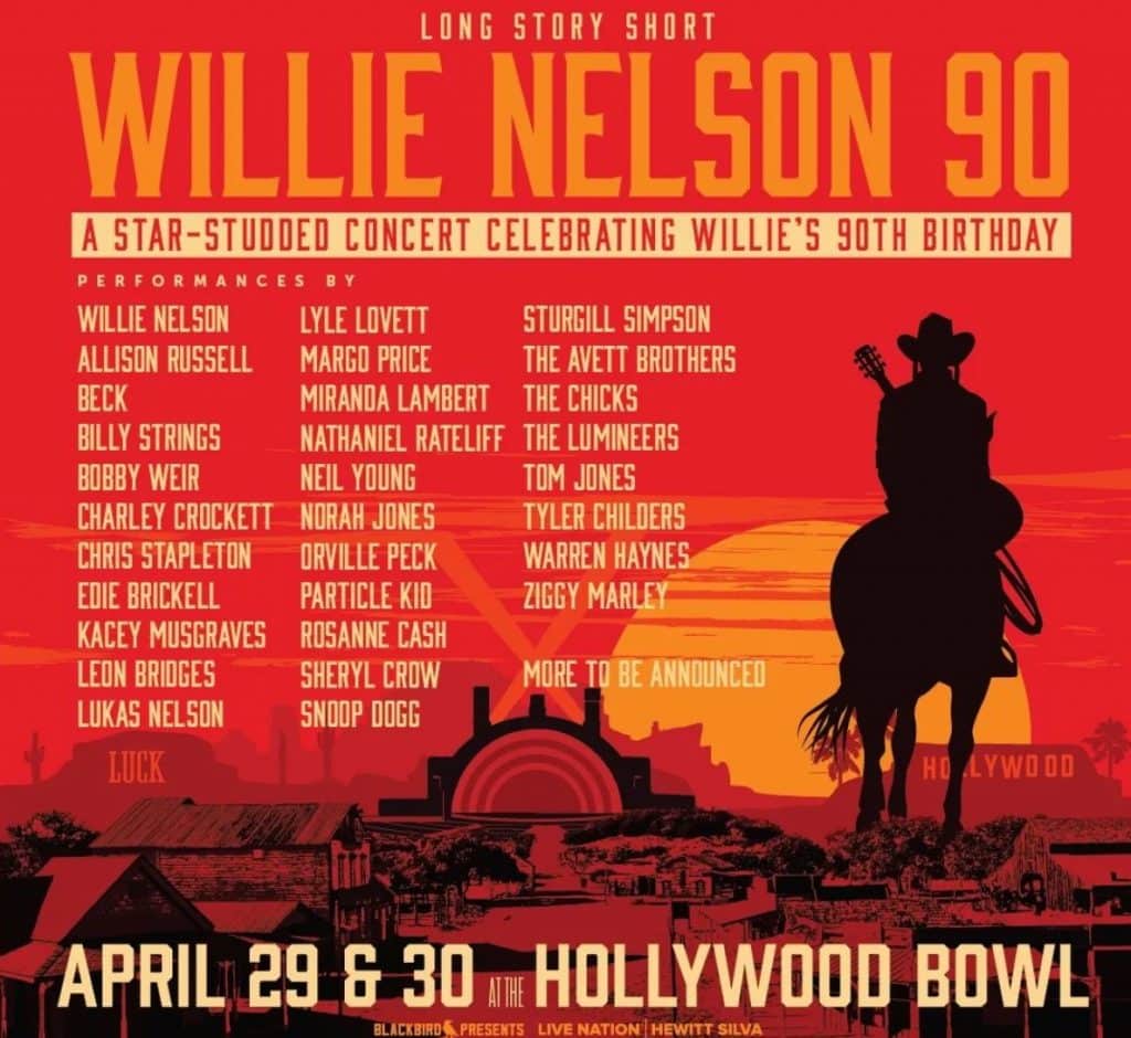 On April 29, 2023, Willie Nelson hosted a 90th birthday concert at the Hollywood Bowl.